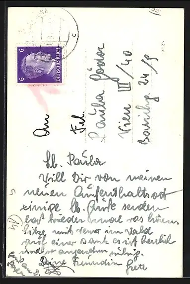 Personenbezogene Daten auf der Rückseite der Karte wurden durch blauen Textmarker unkenntlich gemacht. Die blauen Stellen sind auf die Vorderseite durchgeweicht und wirken sich negativ auf das Postkartenfoto aus