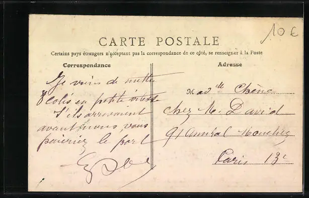 Personenbezogene Daten auf der Rückseite der Karte wurden durch blauen Textmarker unkenntlich gemacht. Die blauen Stellen sind auf die Vorderseite durchgeweicht und wirken sich negativ auf das Postkartenfoto aus
