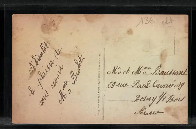 Personenbezogene Daten auf der Rückseite der Karte wurden durch blauen Textmarker unkenntlich gemacht. Die blauen Stellen sind auf die Vorderseite durchgeweicht und wirken sich negativ auf das Postkartenfoto aus