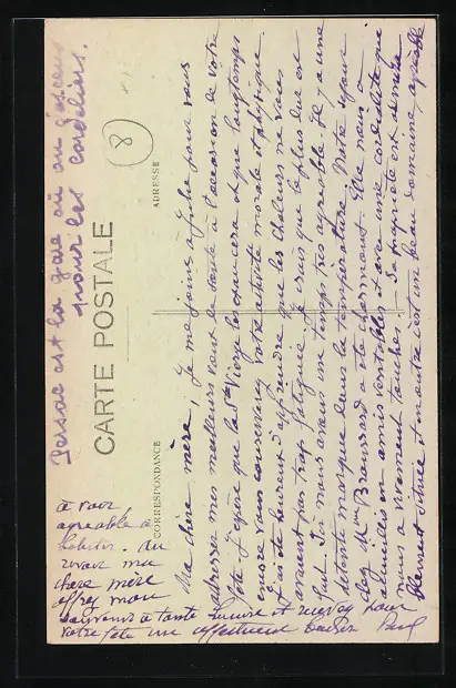 Personenbezogene Daten auf der Rückseite der Karte wurden durch blauen Textmarker unkenntlich gemacht. Die blauen Stellen sind auf die Vorderseite durchgeweicht und wirken sich negativ auf das Postkartenfoto aus