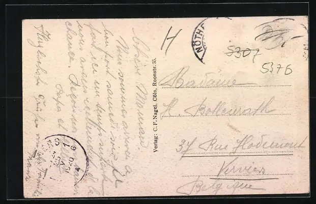 Personenbezogene Daten auf der Rückseite der Karte wurden durch blauen Textmarker unkenntlich gemacht. Die blauen Stellen sind auf die Vorderseite durchgeweicht und wirken sich negativ auf das Postkartenfoto aus