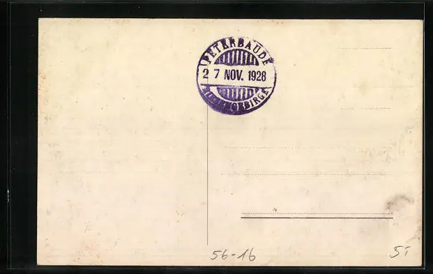 Personenbezogene Daten auf der Rückseite der Karte wurden durch blauen Textmarker unkenntlich gemacht. Die blauen Stellen sind auf die Vorderseite durchgeweicht und wirken sich negativ auf das Postkartenfoto aus