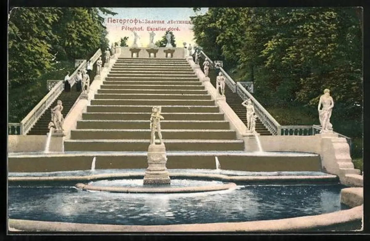 AK Péterhof, Escalier doré, Partie am Brunnen