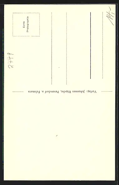 Personenbezogene Daten auf der Rückseite der Karte wurden durch blauen Textmarker unkenntlich gemacht. Die blauen Stellen sind auf die Vorderseite durchgeweicht und wirken sich negativ auf das Postkartenfoto aus