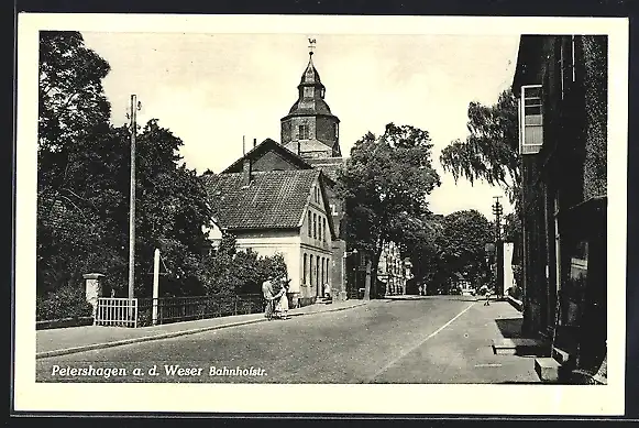 AK Petershagen /Weser, Bahnhofstrasse mit Kirchturm