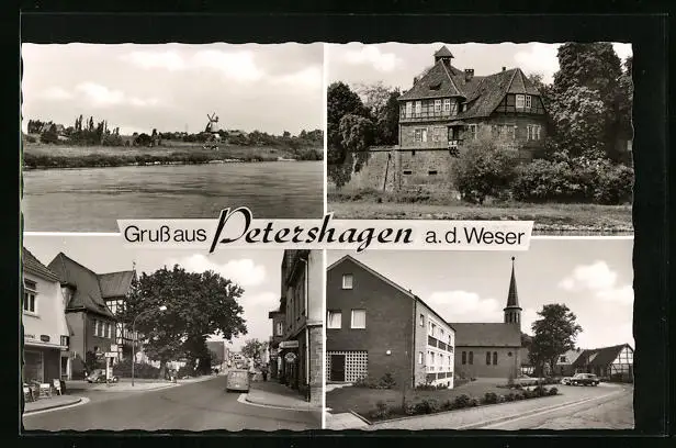 AK Petershagen a. Weser, Uferanlagen mit Windmühle, Platzpartie an der Kirche