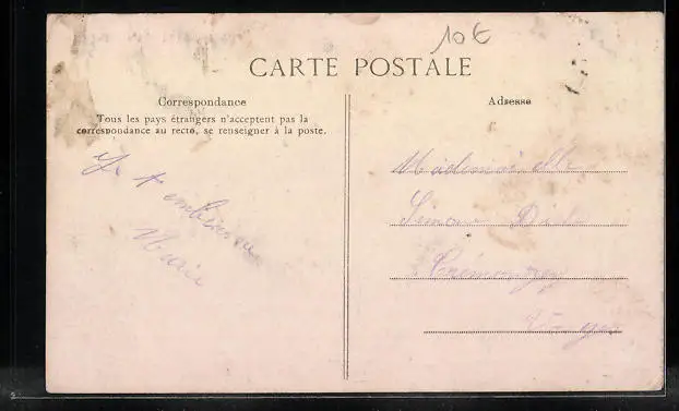 Personenbezogene Daten auf der Rückseite der Karte wurden durch blauen Textmarker unkenntlich gemacht. Die blauen Stellen sind auf die Vorderseite durchgeweicht und wirken sich negativ auf das Postkartenfoto aus