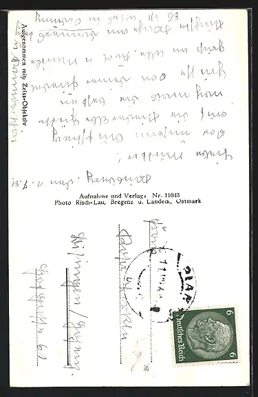 Personenbezogene Daten auf der Rückseite der Karte wurden durch blauen Textmarker unkenntlich gemacht. Die blauen Stellen sind auf die Vorderseite durchgeweicht und wirken sich negativ auf das Postkartenfoto aus