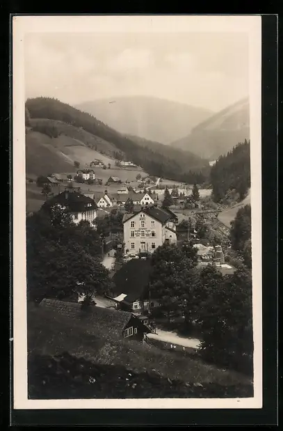 AK Petzer /Riesengebirge, Ortsansicht mit Talblick
