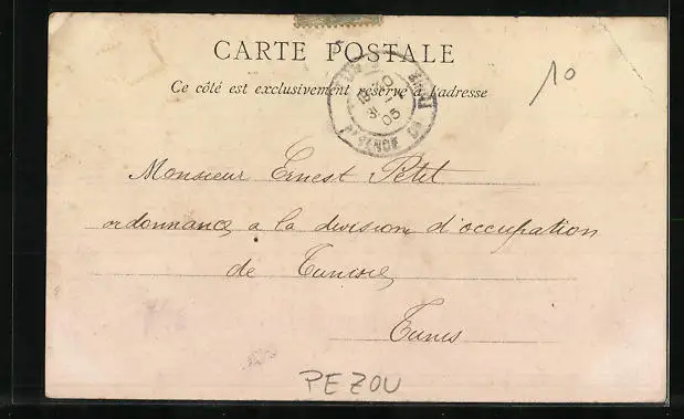Personenbezogene Daten auf der Rückseite der Karte wurden durch blauen Textmarker unkenntlich gemacht. Die blauen Stellen sind auf die Vorderseite durchgeweicht und wirken sich negativ auf das Postkartenfoto aus