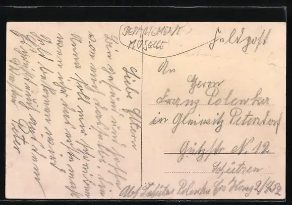 Personenbezogene Daten auf der Rückseite der Karte wurden durch blauen Textmarker unkenntlich gemacht. Die blauen Stellen sind auf die Vorderseite durchgeweicht und wirken sich negativ auf das Postkartenfoto aus