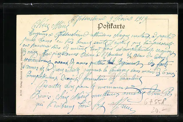 Personenbezogene Daten auf der Rückseite der Karte wurden durch blauen Textmarker unkenntlich gemacht. Die blauen Stellen sind auf die Vorderseite durchgeweicht und wirken sich negativ auf das Postkartenfoto aus