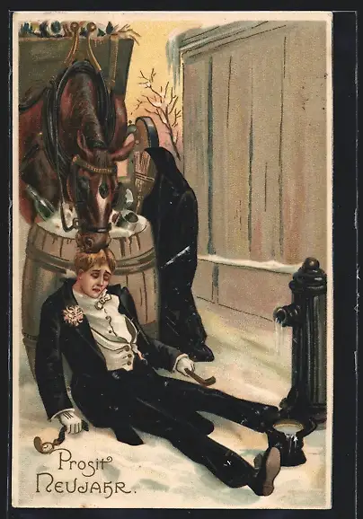 AK Pferd knabbert einem Betrunkenen im Stall am Haar