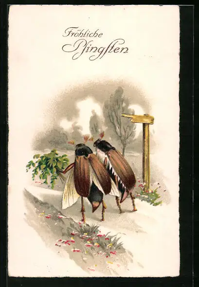 AK Pfingstgrüsse mit Maikäfern auf Wanderschaft