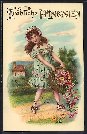 AK Pfingstgruss, Mädchen mit Korb voller Rosen