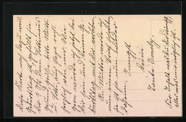 Personenbezogene Daten auf der Rückseite der Karte wurden durch blauen Textmarker unkenntlich gemacht. Die blauen Stellen sind auf die Vorderseite durchgeweicht und wirken sich negativ auf das Postkartenfoto aus