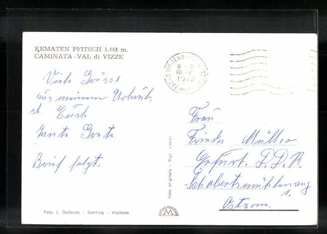 Personenbezogene Daten auf der Rückseite der Karte wurden durch blauen Textmarker unkenntlich gemacht. Die blauen Stellen sind auf die Vorderseite durchgeweicht und wirken sich negativ auf das Postkartenfoto aus