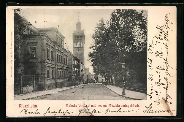 AK Pforzheim, Bahnhofstrasse mit neuem Bezirksamtsgebäude