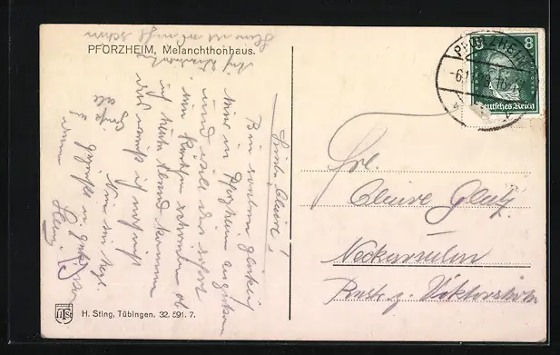 Personenbezogene Daten auf der Rückseite der Karte wurden durch blauen Textmarker unkenntlich gemacht. Die blauen Stellen sind auf die Vorderseite durchgeweicht und wirken sich negativ auf das Postkartenfoto aus