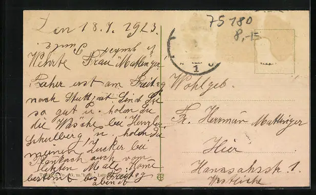 alte Ansichtskarte, gelaufen 1923, Briefmarke entfernt, rückseitig Oberflächenschaden, Stempelspur, guter Zustand