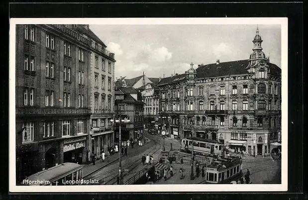 AK Pforzheim, Leopoldsplatz mit Geschäften und Strassenbahn