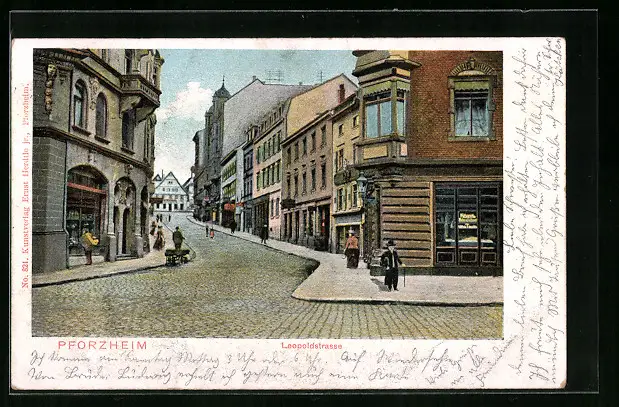 AK Pforzheim, Leopoldstrasse mit Geschäften