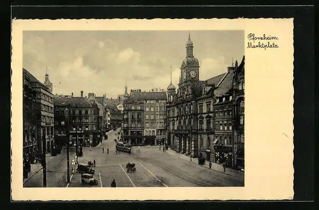 AK Pforzheim, Marktplatz mit Geschäften und Strassenbahn