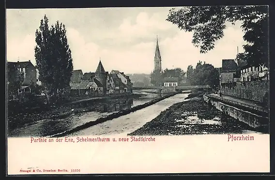 AK Pforzheim, Partie an der Enz, Schelmenturm und neue Stadtkirche