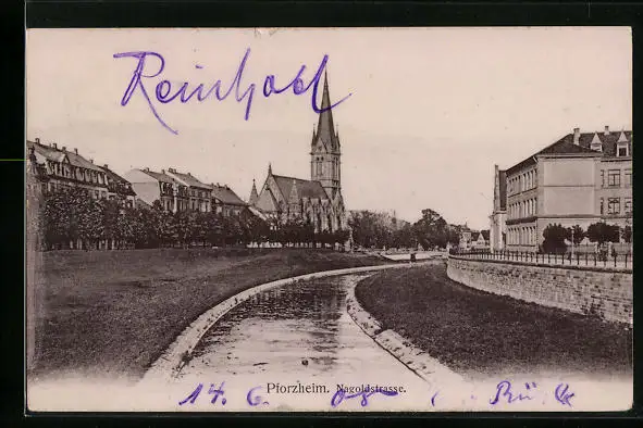 AK Pforzheim, Partie an der Nagoldstrasse, Kirche