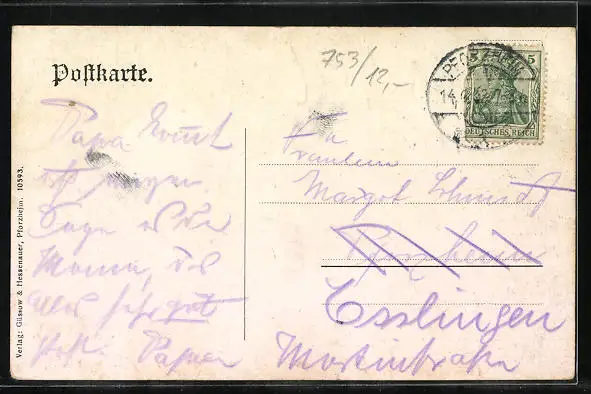Personenbezogene Daten auf der Rückseite der Karte wurden durch blauen Textmarker unkenntlich gemacht. Die blauen Stellen sind auf die Vorderseite durchgeweicht und wirken sich negativ auf das Postkartenfoto aus
