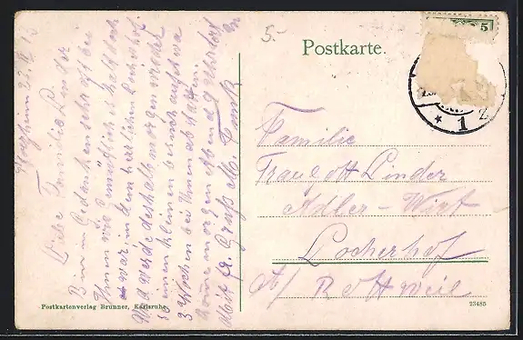 alte Ansichtskarte, gelaufen 1913, Briefmarke entfernt, rückseitig Oberflächenschaden, Eckknick li. unten, Stempelspur, guter Zustand