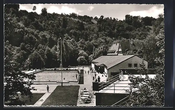 AK Pforzheim, Schwimmbad aus der Vogelschau