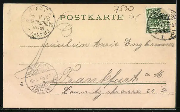 alte Ansichtskarte, gelaufen 1899, Briefmarke tw. entfernt, minimaler Einriss oben mittig, guter Zustand
