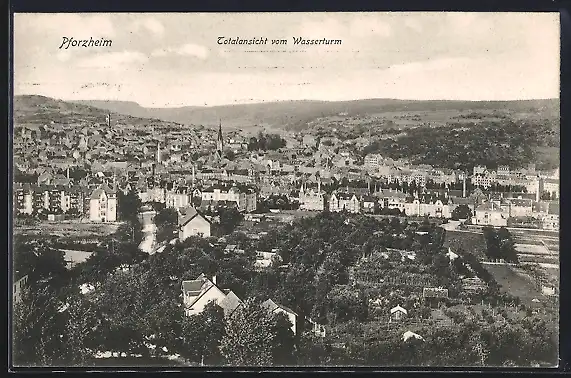 AK Pforzheim, Totalansicht vom Wasserturm