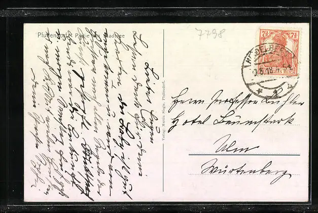 Personenbezogene Daten auf der Rückseite der Karte wurden durch blauen Textmarker unkenntlich gemacht. Die blauen Stellen sind auf die Vorderseite durchgeweicht und wirken sich negativ auf das Postkartenfoto aus