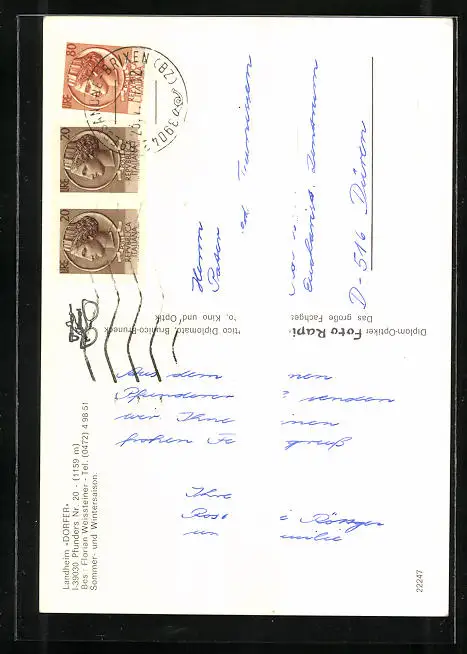 Personenbezogene Daten auf der Rückseite der Karte wurden durch blauen Textmarker unkenntlich gemacht. Die blauen Stellen sind auf die Vorderseite durchgeweicht und wirken sich negativ auf das Postkartenfoto aus