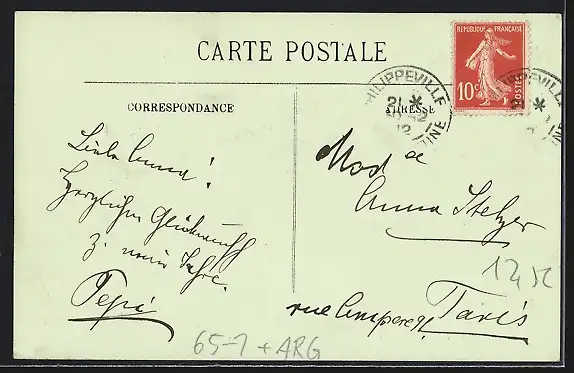 Personenbezogene Daten auf der Rückseite der Karte wurden durch blauen Textmarker unkenntlich gemacht. Die blauen Stellen sind auf die Vorderseite durchgeweicht und wirken sich negativ auf das Postkartenfoto aus