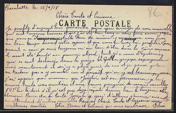 Personenbezogene Daten auf der Rückseite der Karte wurden durch blauen Textmarker unkenntlich gemacht. Die blauen Stellen sind auf die Vorderseite durchgeweicht und wirken sich negativ auf das Postkartenfoto aus