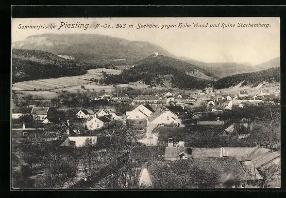 AK Piesting, Totalansicht gegen die Hohe Wand und Ruine Starhemberg