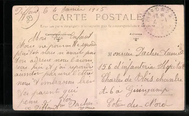 Personenbezogene Daten auf der Rückseite der Karte wurden durch blauen Textmarker unkenntlich gemacht. Die blauen Stellen sind auf die Vorderseite durchgeweicht und wirken sich negativ auf das Postkartenfoto aus
