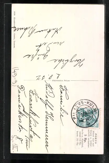 Personenbezogene Daten auf der Rückseite der Karte wurden durch blauen Textmarker unkenntlich gemacht. Die blauen Stellen sind auf die Vorderseite durchgeweicht und wirken sich negativ auf das Postkartenfoto aus