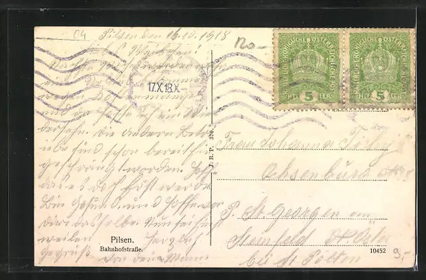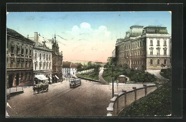 AK Pilsen, Bahnhofstrasse mit einer Strassenbahn