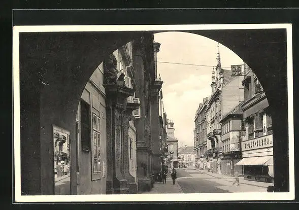 AK Pilsen, Strassenpartie mit Geschäften durch Tor