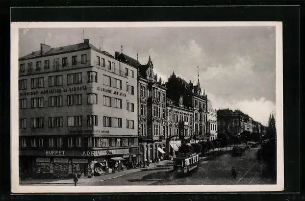 AK Pilsen, Strassenpartie mit Strassenbahn und Adria Buffet