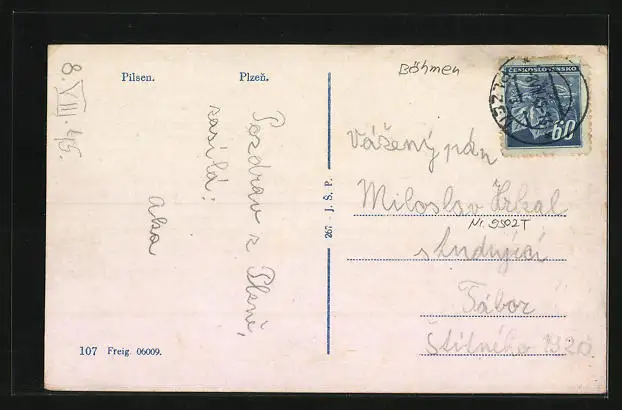 Personenbezogene Daten auf der Rückseite der Karte wurden durch blauen Textmarker unkenntlich gemacht. Die blauen Stellen sind auf die Vorderseite durchgeweicht und wirken sich negativ auf das Postkartenfoto aus