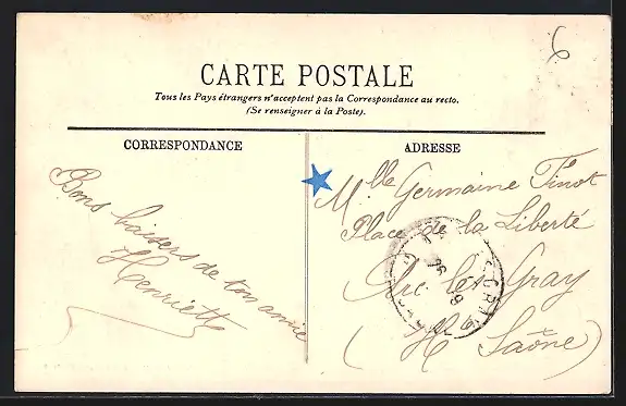 Personenbezogene Daten auf der Rückseite der Karte wurden durch blauen Textmarker unkenntlich gemacht. Die blauen Stellen sind auf die Vorderseite durchgeweicht und wirken sich negativ auf das Postkartenfoto aus