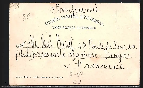 Personenbezogene Daten auf der Rückseite der Karte wurden durch blauen Textmarker unkenntlich gemacht. Die blauen Stellen sind auf die Vorderseite durchgeweicht und wirken sich negativ auf das Postkartenfoto aus