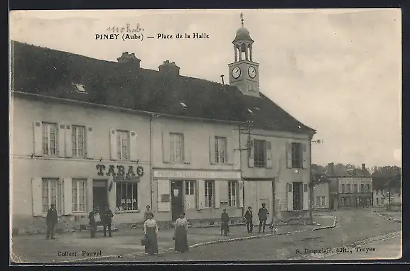 AK Piney, Place de la Halle avec bâtiments et habitants