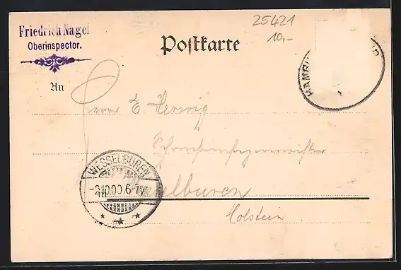 alte Ansichtskarte, gelaufen 1900, Briefmarke entfernt, rückseitig Oberflächenschaden, guter Zustand