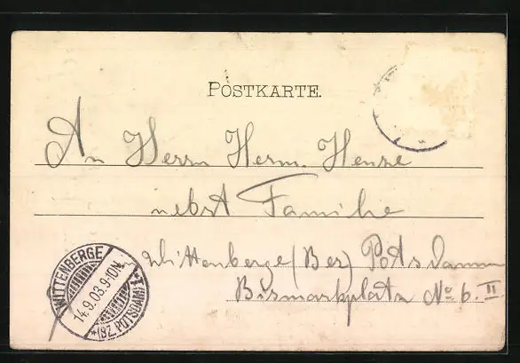 alte Ansichtskarte, gelaufen 1903, Briefmarke entfernt, rückseitig Oberflächenschaden, guter Zustand